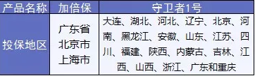 加倍保和多數重疾險一樣,隻限定在北上廣地區,但是守衛者1號的投保地區覆蓋全國約73%的省市,更有優勢。