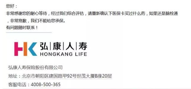 多保魚建議他向弘康人壽提交補充告知,保險公司返回結果是:如果確認是腦栓通,將拒絕承保。