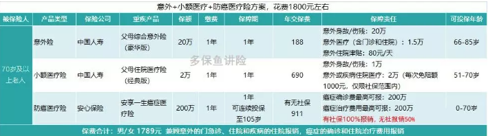 方案③:70歲以上的老人,意外+小額醫療+防癌醫療險方案,花費1800元左右