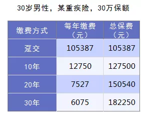 多保魚拿保障型產品的代表,重疾險來舉例分析下,30歲的男性,30萬保額保障終身。