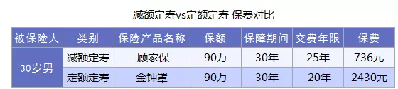 同樣的保額、保障期限和交費年限,顧家保每年保費為908元,金鍾罩的保費為2430元,後者保費翻了近2倍。