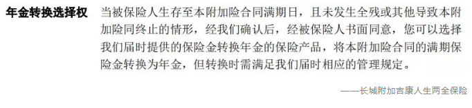 2)合同到期的情況下,將合同的保險金轉換成年金產品,也就是把一次性領取的滿期金換成每年領取的年金。