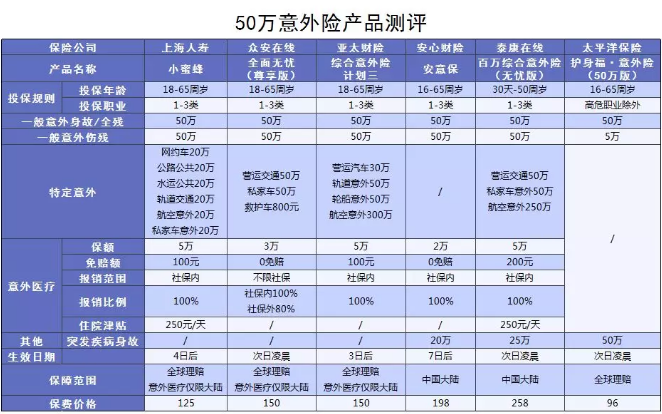 50萬保額,常見交通意外20萬,5萬意外醫療,住院津貼250元/天。