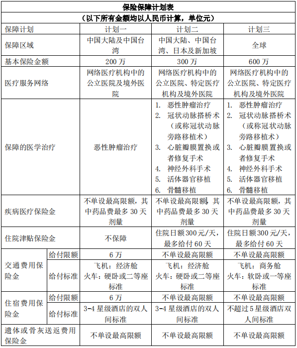 被保人因治療為目的而產生的交通費用(比如轉院治療、骨髓活體移植等)可獲得報銷。第一計劃最高隻能報銷6萬,其他計劃無限額。