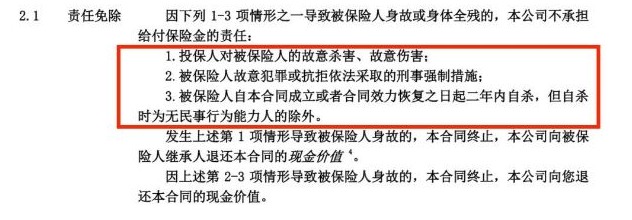 它隻對故意殺害、傷害行為,犯罪和2年內的自殺有免責要求。對吸毒、酒駕、暴亂、核輻射等都沒有免責的要求。