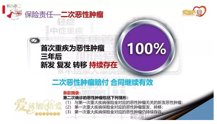 但是,經過惡性腫瘤的治療後,有些人會發生轉移和複發,其中大部分發生在根治性手術後80年內,約占80%;並且愛心人壽的愛加倍第一次惡性腫瘤和第二次惡性腫瘤的間隔時間僅為3年,包括新發惡性腫瘤、複發、轉移和持續性癌症,這大大增加了賠付的幾率,真是一款很有誠意的保險!