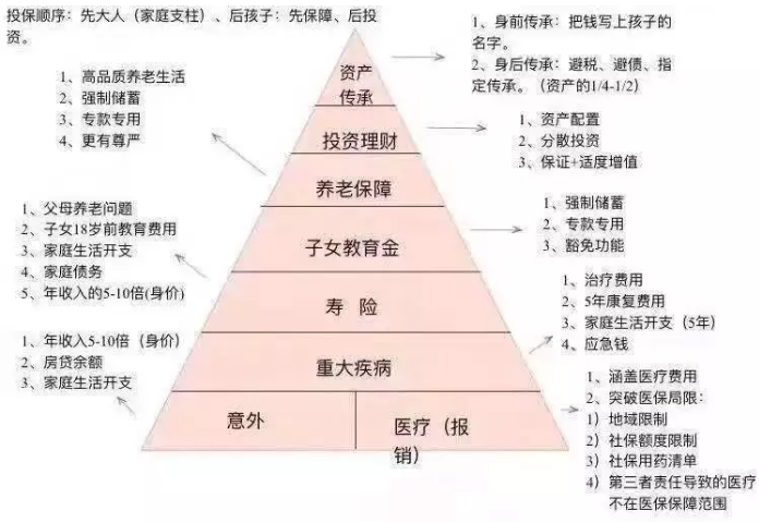下圖是一個常見的保障 金三角族。從配置的底部,一般原則是首先配置基本的保障,然後配置教育和養老金,首先“雪中雪”,然後“錦上添花”。首先覆蓋大風險、然後覆蓋小風險,即孩子之後的第一個成年人(經濟支柱)。這將允許有限的資本預算用於最前沿,以完成家庭資產分配的重要部分。