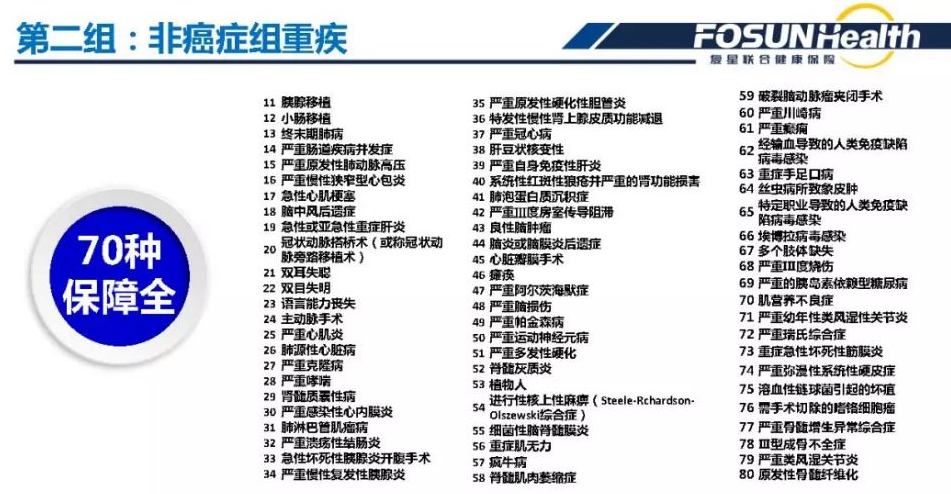 80種疾病分為2組。第一組10種疾病,包括惡性腫瘤、主要器官移植或造血幹細胞移植、終末期腎病三大高危重大疾病;第二組70種疾病包括急性心肌梗死、腦中風後遺症、冠狀動脈搭橋術3種高發疾病。
