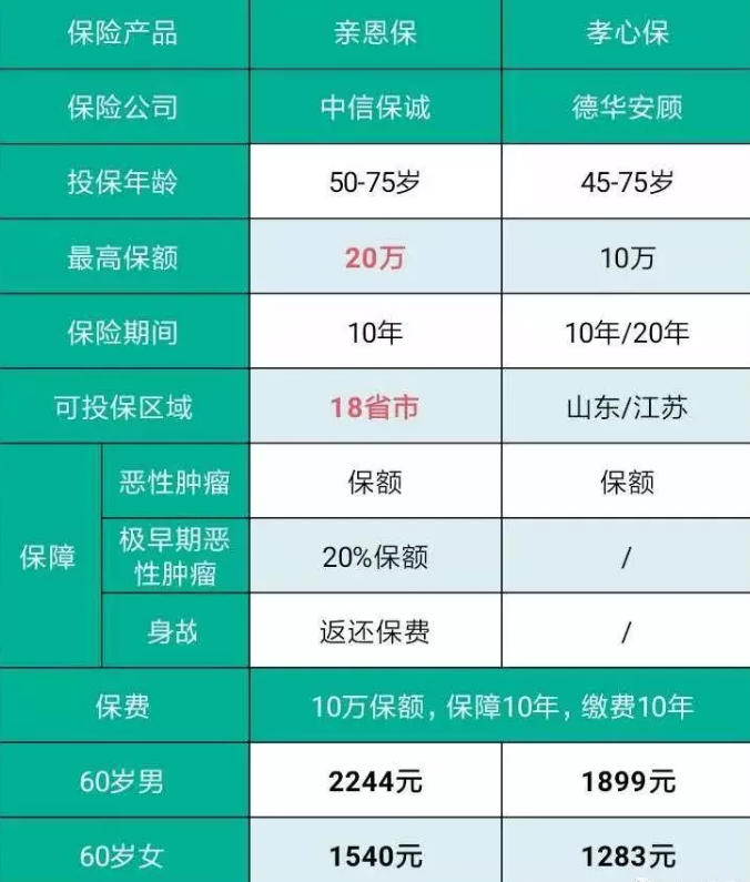 保險金額和保險投保範圍是德華安顧孝心保的缺點,這也是中信保誠親恩保防癌保險的優勢,親恩保B可以投保高達20萬保險,保險範圍包括18個省市;在(zai)保(bao)險(xian)費(fei)用(yong),親(qin)恩(en)保(bao)抗(kang)癌(ai)保(bao)險(xian)仍(reng)然(ran)比(bi)孝(xiao)心(xin)保(bao)更(geng)昂(ang)貴(gui)。主(zhu)要(yao)原(yuan)因(yin)是(shi)親(qin)恩(en)保(bao)包(bao)含(han)非(fei)常(chang)早(zao)期(qi)的(de)惡(e)性(xing)腫(zhong)瘤(liu)保(bao)障(zhang),死(si)亡(wang)也(ye)返(fan)回(hui)保(bao)險(xian)費(fei)用(yong),而(er)孝(xiao)心(xin)保(bao)不(bu)包(bao)含(han)這(zhe)些(xie)。哪(na)一(yi)個(ge)更(geng)劃(hua)算(suan),很(hen)難(nan)得(de)出(chu)結(jie)論(lun),但(dan)是(shi)親(qin)恩(en)保(bao)花(hua)了(le)300多元能獲得2個額外的保障,價格還是不錯的。