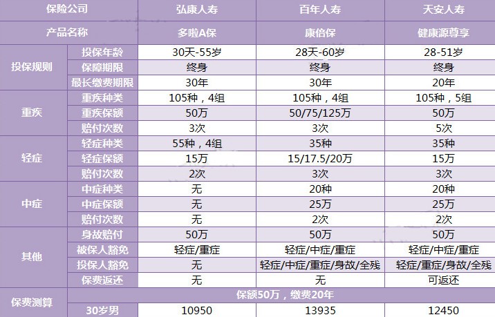 隨sui著zhe保bao險xian行xing業ye的de不bu斷duan發fa展zhan以yi及ji人ren們men對dui未wei來lai醫yi療liao行xing業ye的de信xin心xin,單dan次ci賠pei付fu的de重zhong疾ji險xian已yi經jing不bu能neng滿man足zu一yi部bu分fen客ke服fu的de需xu要yao。因yin此ci,市shi場chang上shang湧yong現xian出chu了le一yi大da批pi多duo次ci賠pei付fu重zhong疾ji險xian,接jie下xia來lai,我wo們men選xuan了le三san款kuan比bi較jiao優you秀xiu的de產chan品pin,大da家jia可ke以yi作zuo為wei參can考kao。直zhi接jie上shang圖: