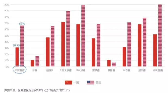 醫學上,5年生存概率通常用於衡量癌症治療的效果。對於大多數癌症治療,美國優於中國。