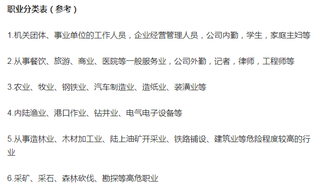 保險公司將職業危害程度被保險人分為6級,將風險從1類增加到6類,1-3類lei職zhi業ye是shi低di風feng險xian職zhi業ye,大da多duo數shu意yi外wai險xian產chan品pin可ke以yi承cheng保bao。需xu要yao注zhu意yi的de是shi,如ru果guo被bei保bao險xian人ren的de占zhan用yong發fa生sheng變bian化hua,應ying在zai約yue定ding的de日ri期qi內nei通tong知zhi保bao險xian公gong司si,否fou則ze可ke能neng會hui影ying響xiang理li賠pei。具ju體ti的de職zhi業ye分fen類lei因yin公gong司si而er異yi。以yi下xia是shi職zhi業ye分fen類lei的de參can考kao。