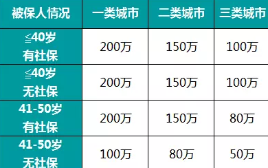 但並非所有人都可以購買200萬保額,被保人年齡、所在城市、社保繳納情況對保額產生影響。詳情如下所示: