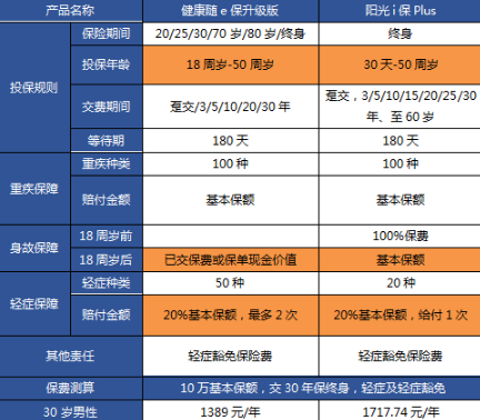 2.投保年齡:健康隨e保升級版,升級的重點是嚴重疾病的類型和輕症賠付,但暫時隻升級到成人版,所以保險年齡是18歲 - 50歲。陽光i保險是30至50周齡,30天至17歲可保到50萬,全部201個城市。