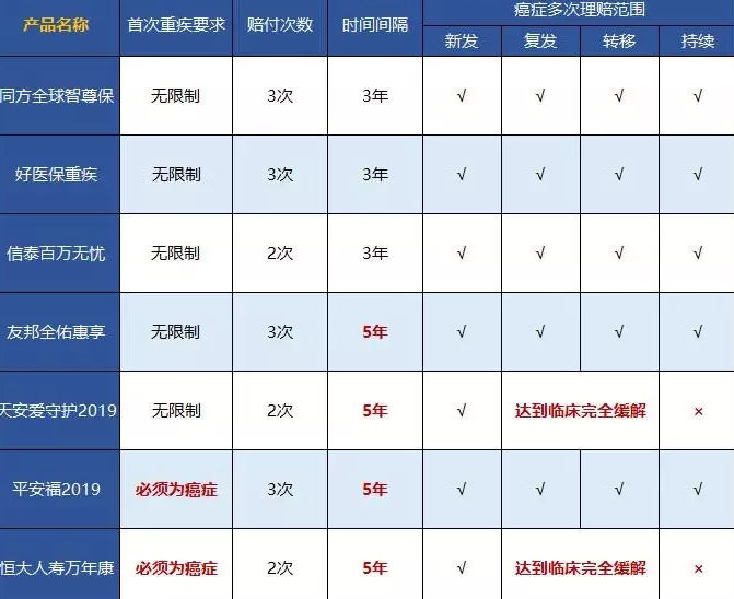 賠付時間間隔短:據統計,大多數癌症複發將在治療後3年內發生,因此盡量選擇相隔3年的多次賠付的產品。通常不建議選擇5年後可能丟失的產品。