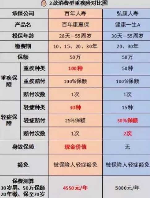 消費者型重大疾病保險:純保障型產品,無死亡責任,可以選擇保障到70/80 /終身,隻有患重病或輕症才能得到賠付,所以保費比較便宜。