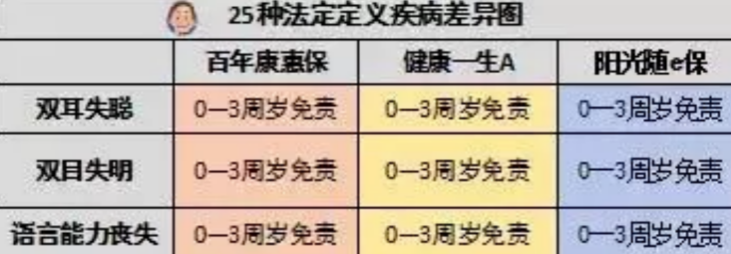 這三種產品在25種法定重疾理賠中具有相同的時間限製,例如“雙目失聰、雙耳失明、語言能力喪失”三種重疾所有都免於3歲以下。