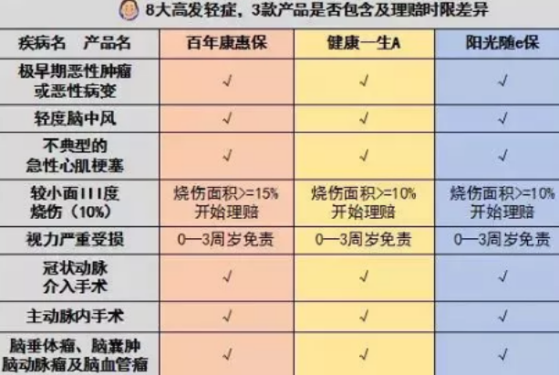 由於對輕症沒有統一的規定,我根據保險公司的理賠數據找到了8款高位輕症,判斷這三個產品是否覆蓋了理賠的時差,如下圖所示:
