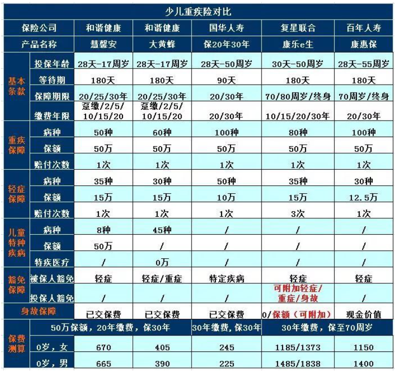 weilefangbiandajia,womenjiangertongdezhongdajibingbaoxianyushichangshangdegaoxingjiabijinxinglebijiao。youjizhongmoxingbingbuzhuanmenzhenduiertongdetedingyanzhongjibing,danbaozhangyefeichangquanmian,ruxia: