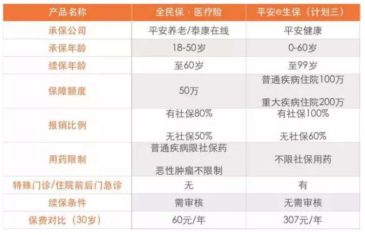 事實上,仔細觀察,“全民保”是經典百萬醫療產品的“瘦身版”,多保魚將其與平安e生保進行比較。