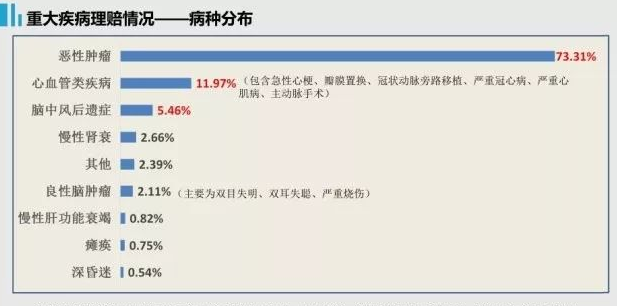 保險重大疾病保險不是更多類型的疾病,在重症疾病保險中普遍存在的六大疾病:惡性腫瘤、急性心肌梗死、主要器官移植或造血幹細胞移植、冠狀動脈旁路移植術、終末期腎病、中風後遺症占絕對比例(概率超過80%),這基本上滿足了一般保單持有人的保障需求,保障範圍涵蓋了50種嚴重疾病,遠遠超過保險行業協會定義的嚴重疾病數量(25種),覆蓋範圍賠付可以達到97%。就概率而言,其中有四十個和幾百個沒有太大的不同。