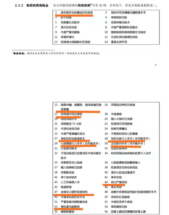 我們知道所有重大疾病保險包括銀保監會規定的25種規定,基本覆蓋95%的發病率嚴重的疾病,所以嚴重疾病的升級沒有多大實際意義,但每個家庭可以自由地玩輕症。雙重保護包括56種輕症,市場上很少有超過56種輕症。輕症例如非典型心肌梗死、輕度中風後遺症、冠(guan)狀(zhuang)動(dong)脈(mai)介(jie)入(ru)手(shou)術(shu)和(he)微(wei)創(chuang)手(shou)術(shu)及(ji)其(qi)他(ta)非(fei)胸(xiong)腔(qiang)開(kai)腹(fu)手(shou)術(shu),包(bao)括(kuo)冠(guan)狀(zhuang)動(dong)脈(mai)介(jie)入(ru)和(he)微(wei)創(chuang)搭(da)橋(qiao),均(jun)為(wei)輕(qing)症(zheng),其(qi)中(zhong)包(bao)括(kuo)重(zhong)症(zheng)疾(ji)病(bing)產(chan)品(pin)在(zai)市(shi)場(chang)上(shang)並(bing)不(bu)常(chang)見(jian),要(yao)麼(me)缺(que)失(shi)一(yi)個(ge),要(yao)麼(me)兩(liang)個(ge)一(yi)起(qi)缺(que)失(shi),而(er)輕(qing)症(zheng)3額外的30%保額賠付,每個賠付沒有間隔期,是目前市場上最好的版本輕症保障。