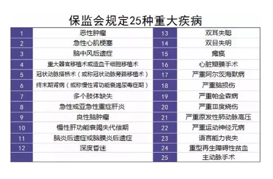 保監會規定大陸重疾的25種重大疾病,而這25種重大疾病,已經占了所有重疾理賠的95%以上: