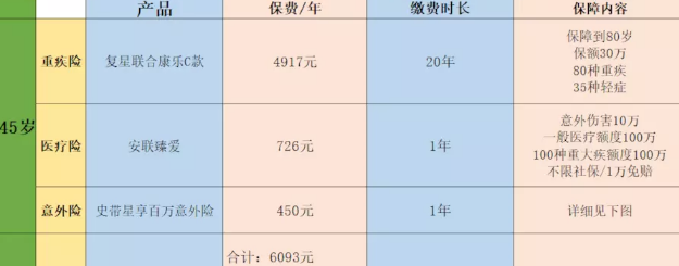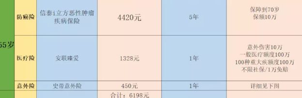 主要基於6000元每年保費的預算,45歲和50歲的重大疾病保險計劃采用消費型嚴重的疾病風險。在55歲時,它是防癌險,價格比重疾險便宜,抗癌健康告知更放鬆。一些有身體狀況的父母更容易通過核保。