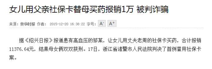這不是危言聳聽。在2015年,就有新聞報道過,浙江一女子因冒用父親社保卡替母親買藥報銷,與母親被雙雙判刑。