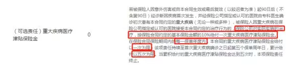 即:確診重疾後,在指定醫院治療的,每年給付一次額外10%基本保額的保險金,持續至確診日後的第5個保單日,累計給付5次。