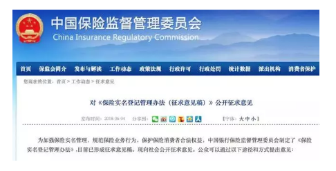 今年的6月4號,銀保監會發布了《保險實名登記管理辦法》的征求意見稿。