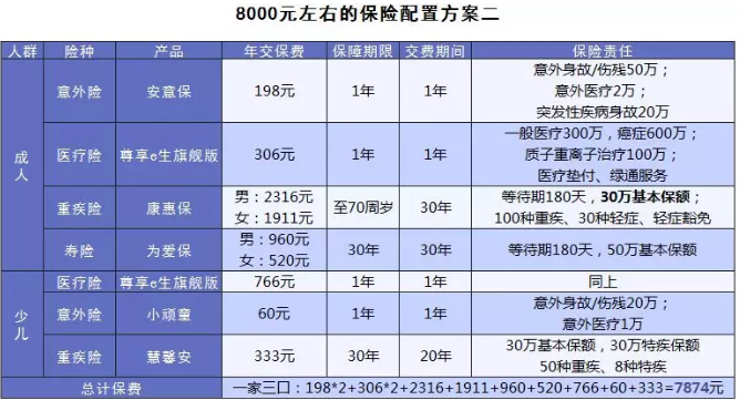 2)8000元左右,我們可以有兩種選擇,一是盡可能做高大人的保額,使保障更全麵;另一種就是在保障了大人的基礎上,將剩下的預算給孩子買保險。