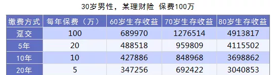 前期投入100萬,後期的生存收益有400萬。同樣100萬,分期交10年和20年的收益差了將近60萬。