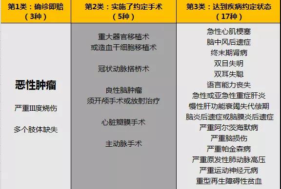 以這25種重疾為例,重疾的理賠大致可以分為三類:1、確診即賠;2、實施了某種手術才能賠;3、達到某種疾病狀態才能賠。