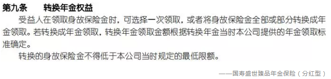 1)合同出險的情況下,所得的保險金額(身故保險金)不一次性領取,而是轉換成年金,每年固定領取。
