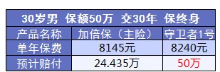 雖然守衛者1號每年的保費要高一百塊,但是在身故保障上,一個是50萬基本保額,一個是24萬已交保費,兩者相差近一倍,守衛者1號更優。