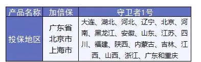 加倍保和多數重疾險一樣,隻限定在北上廣地區,但是守衛者1號的投保地區覆蓋全國約73%的省市,更有優勢。