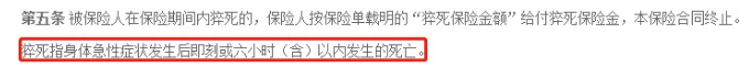 條款規定,隻要在6個小時內發生的死亡都可以作為猝死來賠付。