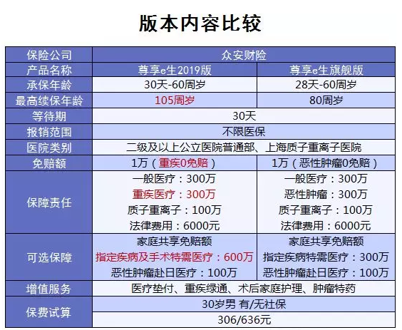 價格上,升級後的尊享e生2019版與旗艦版持平,甚至超值保障還在部分特定年齡降低了保費。