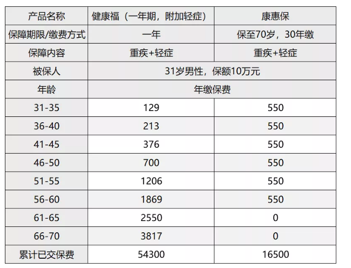 現在來看看直觀的對比,以下是健康福(一年期)和百年康惠保年繳保費對比: