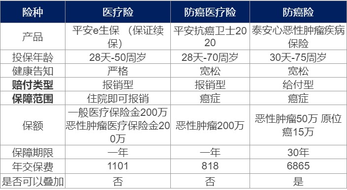 防癌醫療險和醫療險都是一年期的產品,買一年保一年,而防癌險是長期險,可以選擇保障10年/20年/30年,並且費率是恒定的。防癌醫療險和醫療險會麵臨保費增加以及因健康告知而無法再購買的問題,而防癌險則不會麵臨這種問題。
