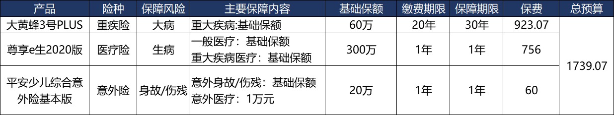 舉例說明:定期的重疾險保費923元可以保障60萬的保額,同時搭配一份百萬醫療險,保費756元可以保障300萬的報銷額度,保障家庭有足夠的錢用於給孩子治病看病、康複,維持孩子治愈後的生活水平。意外險同樣是不可少的,60元的保費可以保障20萬的保額,彌補意外帶來的傷害。總體保費在1739.07元。