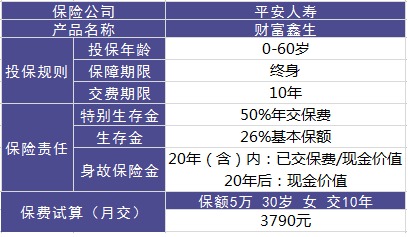 保魚君舉個栗子來具體說明吧:王先生為妻子李女士(30 周歲)投保平安財富鑫生年金保險,基本保險金額 50000 元,交費期為 10 年,月交保險費 3790 元,指定身故保險金受益人為兒子小王,則: