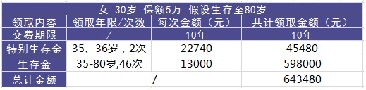 也就是說,在李女士80歲時,除了可以拿到身故保險金以外(此時身故保險金為合同的現金價值),還拿到了固定領取的64.348萬元。