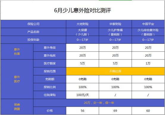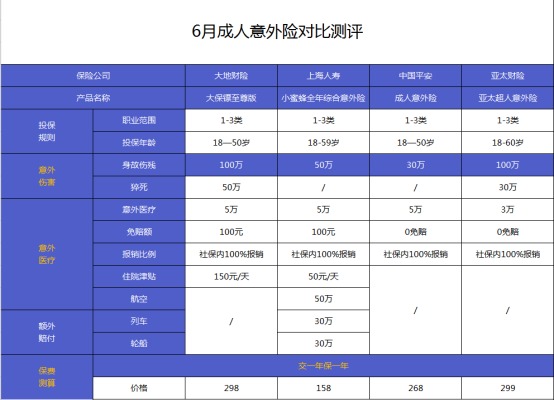 duiyuchengnianrenlaishuo,yidanzaoyuzhongdadeyiwaishanghai,fashengshangcanhesiwang,geijiatingdailaideyingxiangshijinhuhuimiexingde。yinci,duiyuchengnianrenlaishuo,yiwaishenguheshangcandepeifucaishiyiwaixianchanpinxuanzeshishouxianyaokaolvdeyinsu,duiyugongzuoyalidaderenqunti,haiyaokaolvshifouchanpinzhongshifoudaiyoucusibaozhang。6月份的意外險小編為大家精選了以下4款產品: