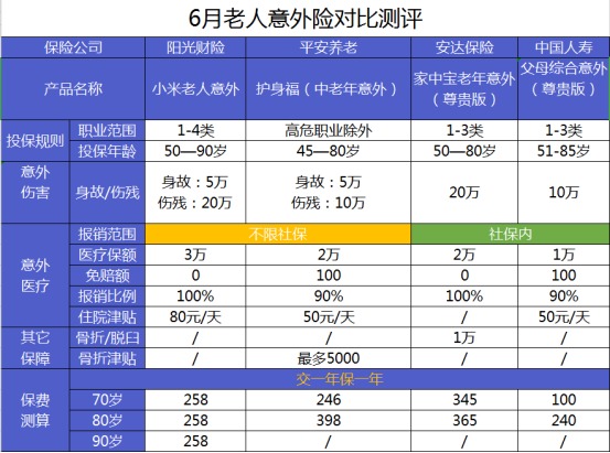 老年人由於年紀大了,腿腳不便,自我保護能力下降,而且容易因意外引發其它的並發症。因(yin)此(ci),意(yi)外(wai)傷(shang)害(hai)醫(yi)療(liao)額(e)度(du)對(dui)老(lao)人(ren)來(lai)說(shuo)非(fei)常(chang)重(zhong)要(yao),並(bing)且(qie)意(yi)外(wai)傷(shang)害(hai)保(bao)險(xian)和(he)意(yi)外(wai)津(jin)貼(tie)可(ke)以(yi)提(ti)供(gong)有(you)效(xiao)的(de)幫(bang)助(zhu)。針(zhen)對(dui)老(lao)年(nian)人(ren)的(de)意(yi)外(wai)險(xian),小(xiao)編(bian)推(tui)薦(jian)以(yi)下(xia)4款產品: