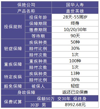 蓋世英雄是一款單次賠付保障終身的重疾險,重疾賠1次,輕症賠1次,賠付基本保額的30%,男性特定疾病額外賠付30%。總體來說,保障方麵沒什麼問題,保障性不錯。