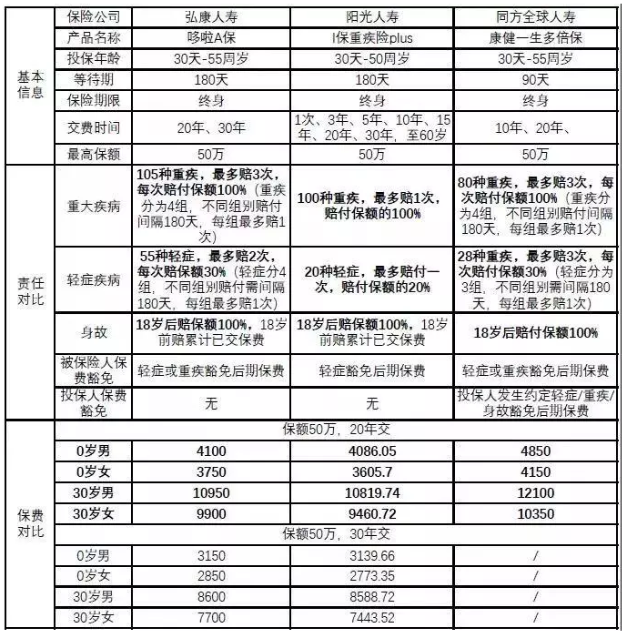關(guan)注(zhu)重(zhong)大(da)疾(ji)病(bing)保(bao)險(xian)的(de)情(qing)況(kuang),確(que)定(ding)他(ta)們(men)需(xu)要(yao)購(gou)買(mai)重(zhong)大(da)疾(ji)病(bing)保(bao)險(xian)時(shi),一(yi)定(ding)要(yao)考(kao)慮(lv)保(bao)險(xian)條(tiao)款(kuan)和(he)保(bao)障(zhang)方(fang)麵(mian)。您(nin)可(ke)以(yi)優(you)先(xian)考(kao)慮(lv)市(shi)場(chang)上(shang)具(ju)有(you)良(liang)好(hao)聲(sheng)譽(yu)的(de)幾(ji)種(zhong)產(chan)品(pin),然(ran)後(hou)比(bi)較(jiao)重(zhong)點(dian)。側(ce)重(zhong)點(dian)大(da)致(zhi)可(ke)分(fen)為(wei):保障種類、賠付次投保費用。我選擇了以下三種重症疾病產品進行比較。當每種產品的優點一目了然時,很容易做出選擇。