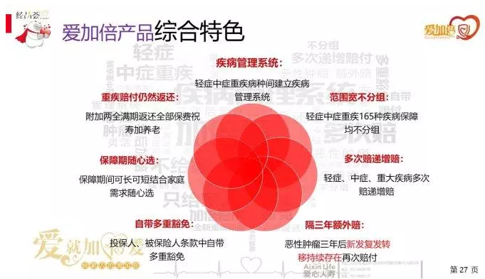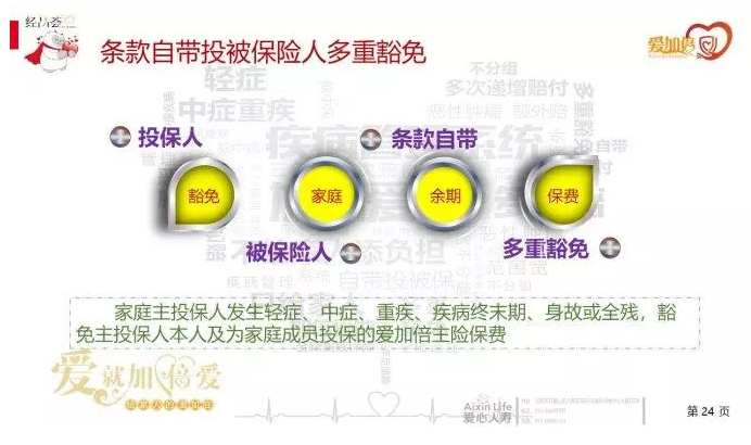 愛加倍是被保險人輕症豁免、 中症豁免、重疾豁免、死亡或完全殘疾豁免、疾病結束期豁免;這應該是市麵上首款自帶投保人豁免費用的重疾產品;在夫妻互保中,例如,40歲,購買50萬其他產品,被保險人的費用為豁免約1000元,而在愛加倍中,這筆費用免除,真真的是客戶的大福利呢,愛加倍果真加倍愛!