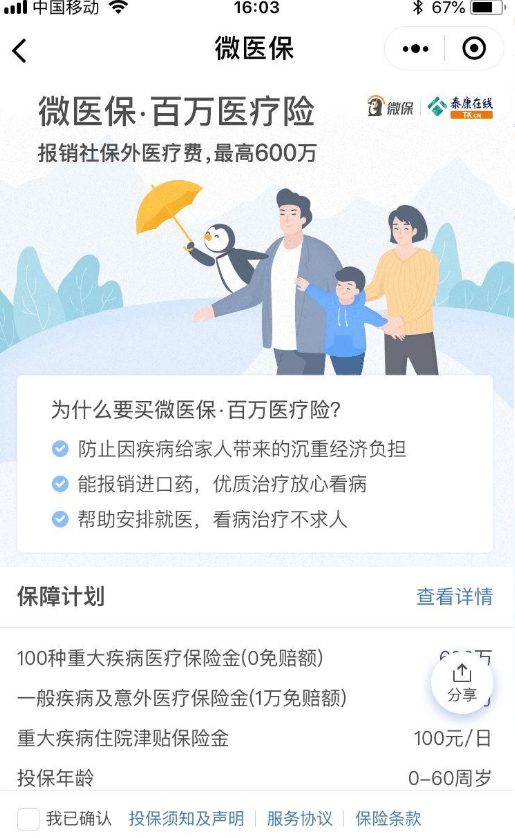 就是我們這個產品是多少錢,保多長時間(保障期),誰能買(健康告知嚴格不嚴格)。微保產品可以輕鬆支付每月/每年的付款,即使使用信用卡,這是非常好的。這個醫療保險是一年期間,與市場上的大多數產品相同(但也有5年保證續保產品:複星合並樂享一生萬醫療保險產品分析)。無論保障如何,產品都是全麵的。如果隻有少數人可以購買它,也會覺得是渣渣。我們來看看這個產品的健康告知: